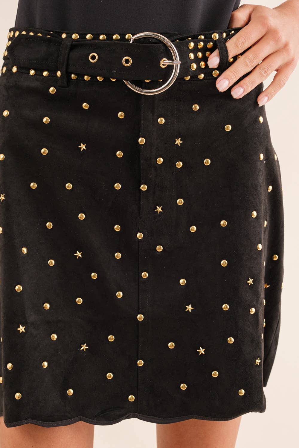 This playful suede mini skirt features star studs, a scalloped hem, and a belted waist for a fun Western-inspired look.