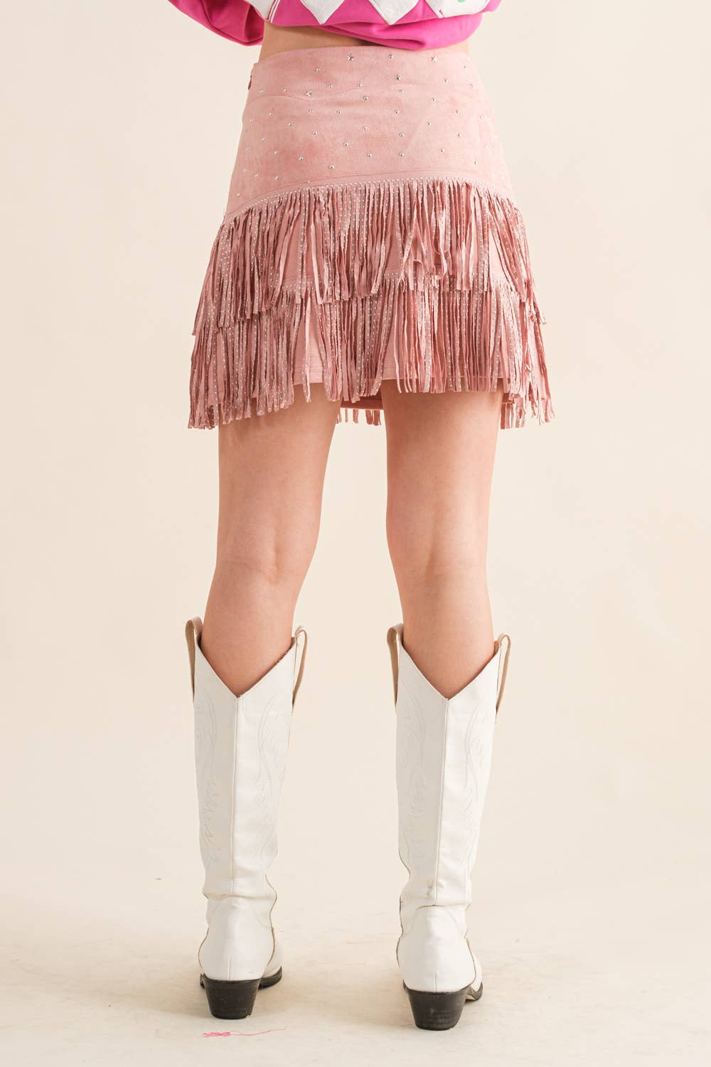 This playful mini skirt features suede material with star-shaped silver studs and layered fringe, capturing a fun Western vibe.