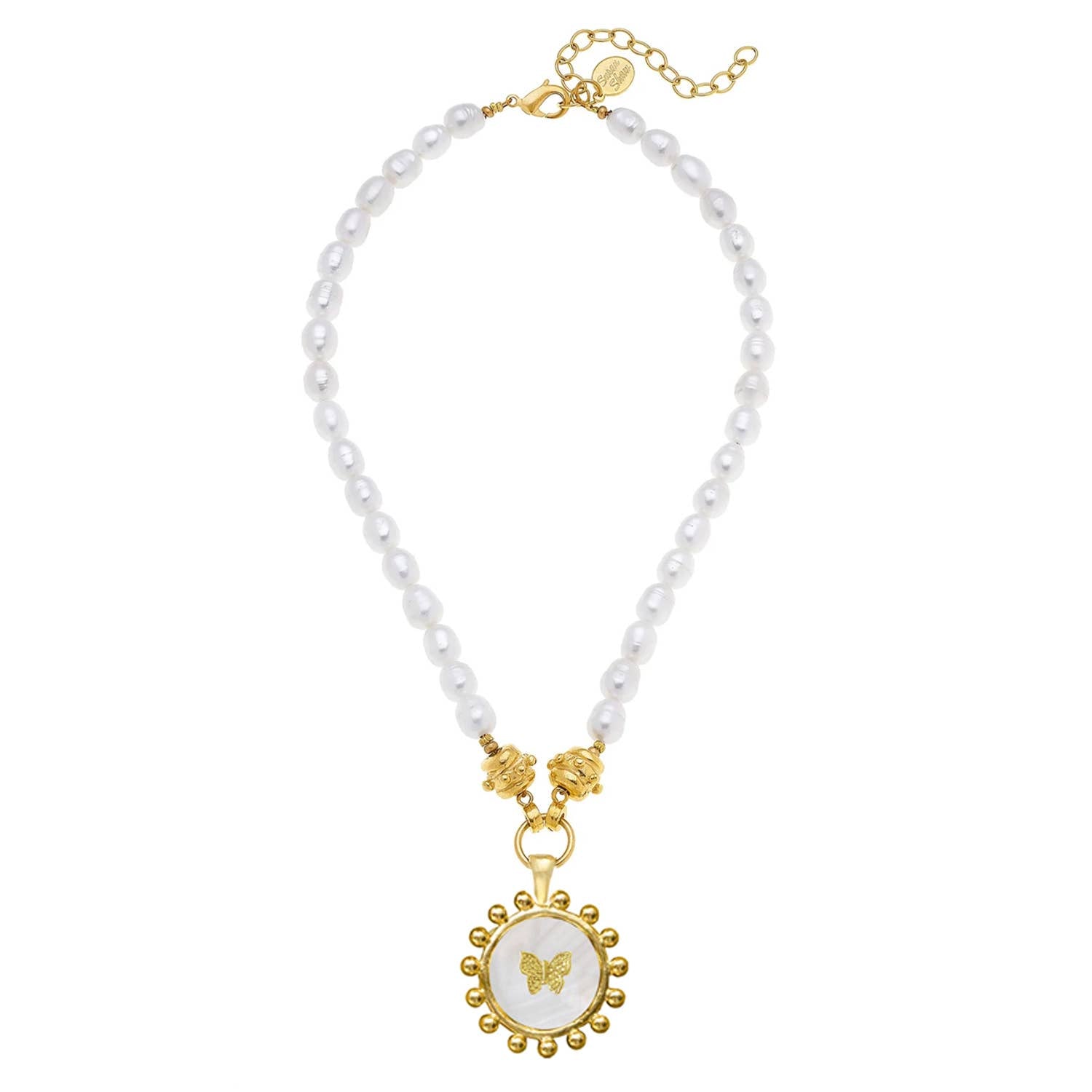 This necklace features genuine freshwater pearls and a glistening Mother of Pearl pendant, adorned with a delicate butterfly. Symbolizing hope...