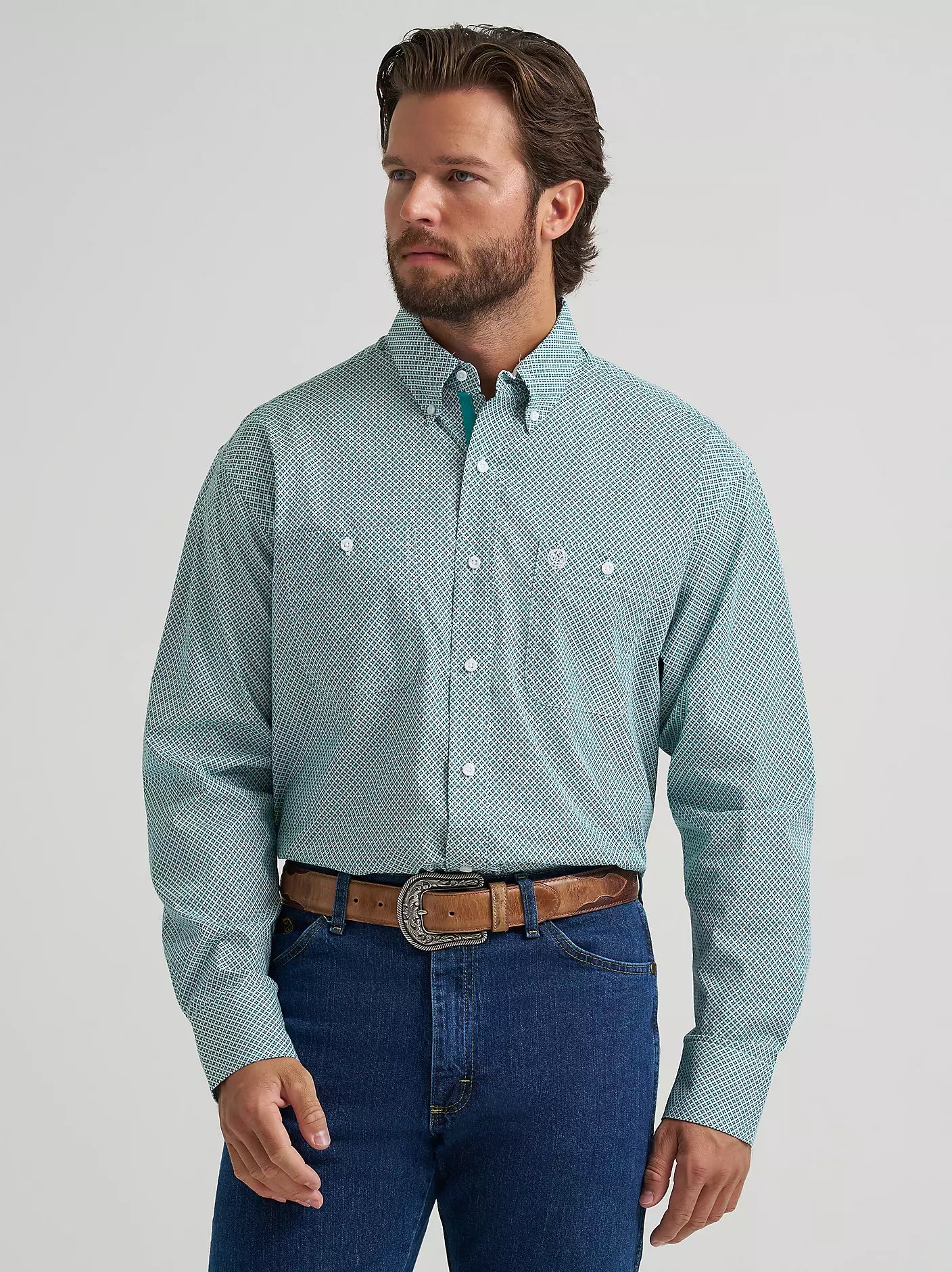 Wrangler® George Strait™ Aqua Cross Long Sleeve Button Down Two Pocket Shirt