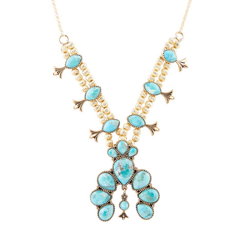 Upgrade your jewelry collection with our Floral Statement Turquoise Golden Necklace. The genuine turquoise stones, set in intricate golden bezels...