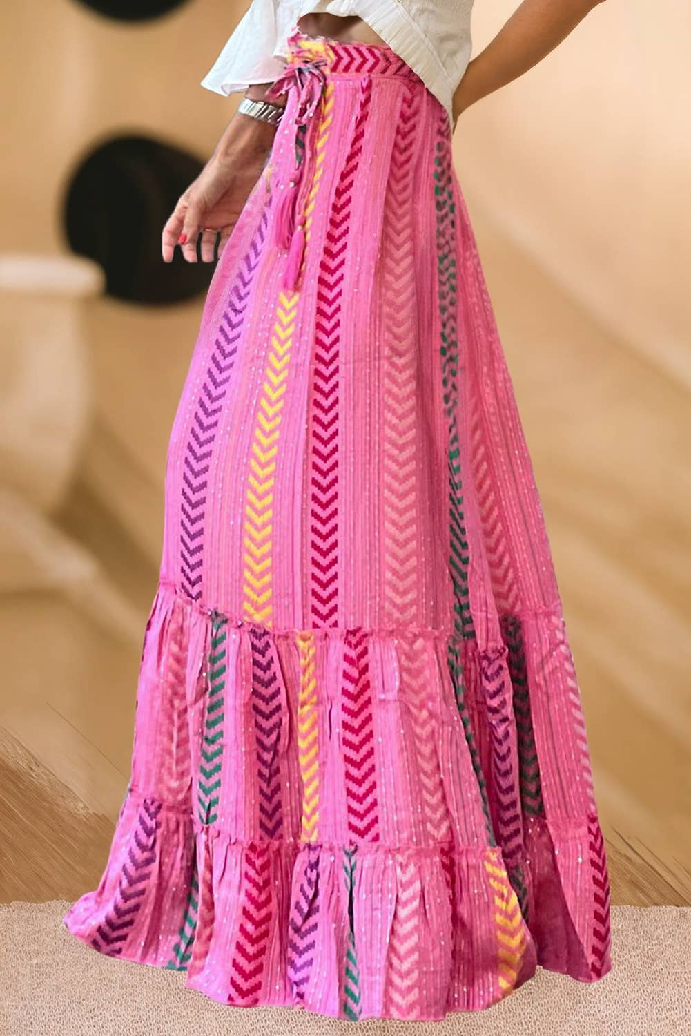 Boho Tiered Ruffle Skirt with Side Ties This lightweight boho-inspired skirt features a chic geometric print and tiered ruffle details...
