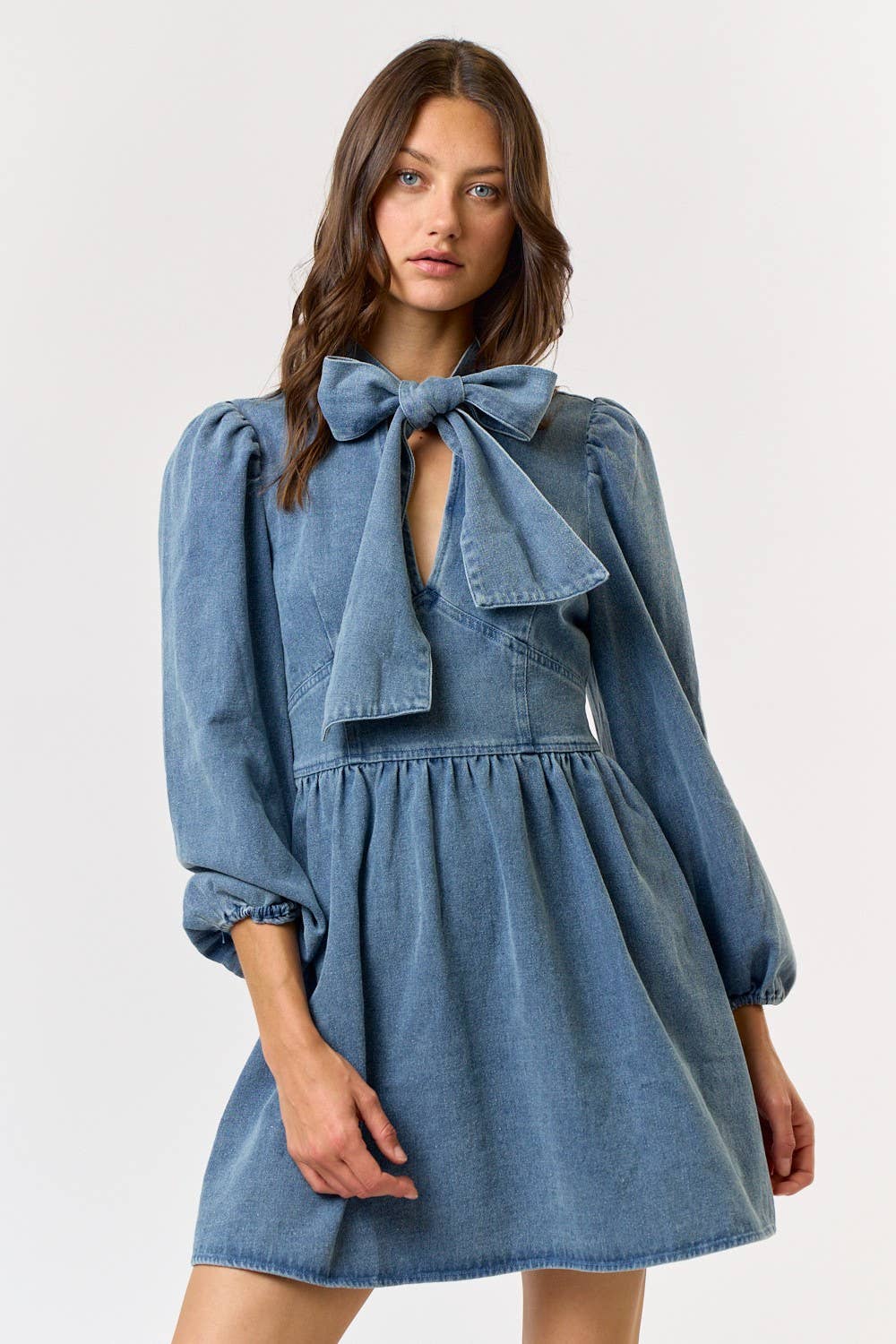 Bow Neck Tie Smocked Back Denim Babydoll Dress