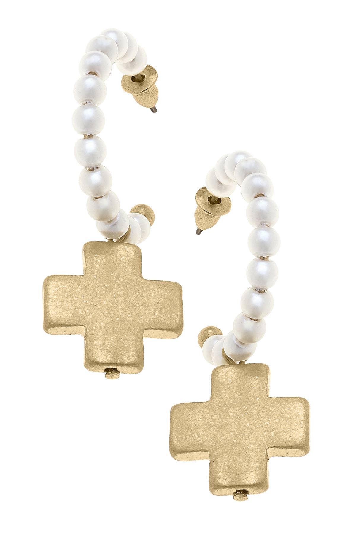 Canvas Style Edith Pearl Hoop Square Cross Drop Earrings in Worn Gold