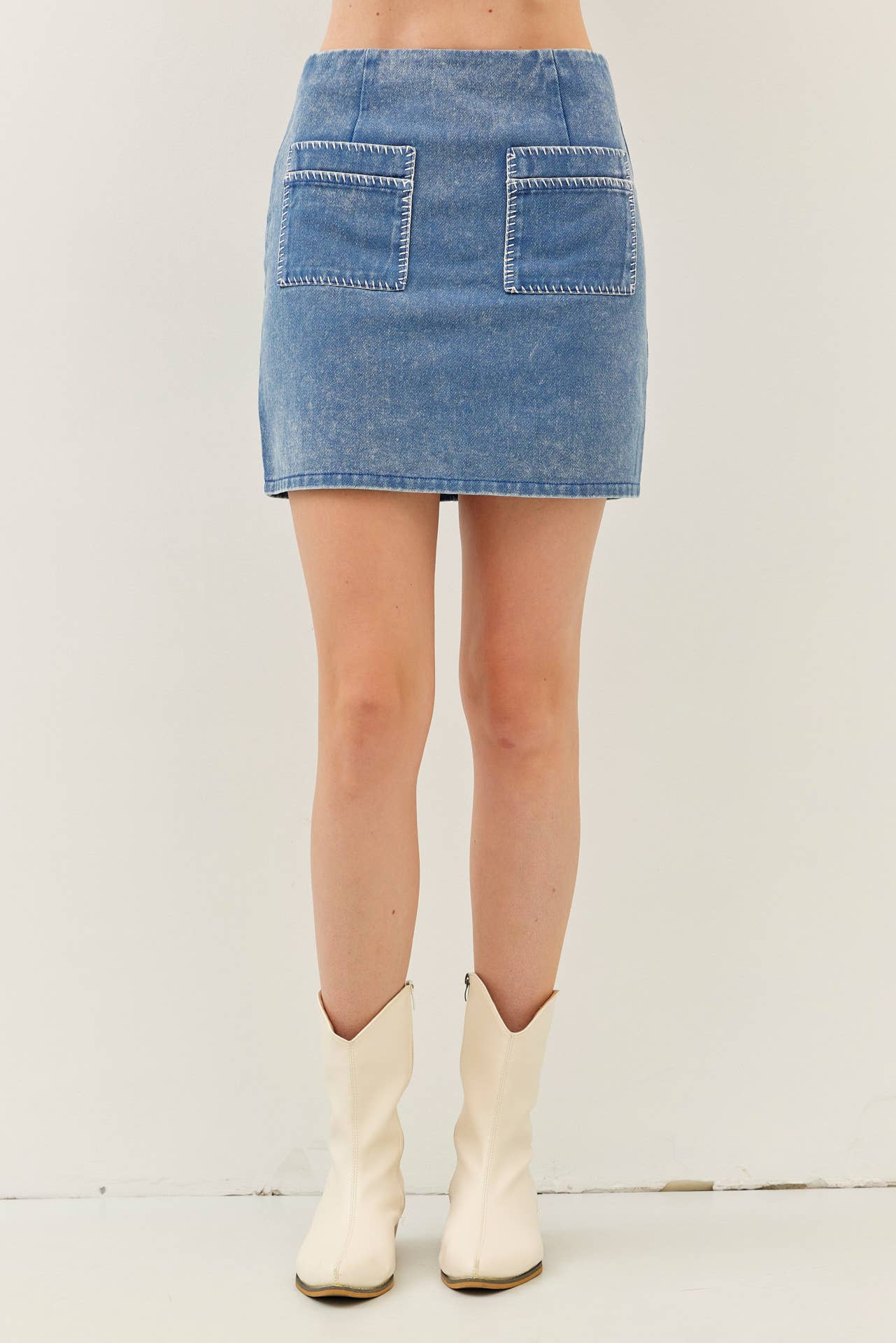 This lively mini skirt is made from soft, washed cotton denim and features front pockets accented with contrast stitching. It...