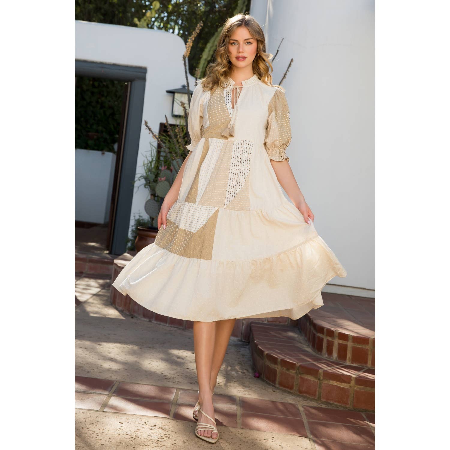 This Hand Embroidered Patchwork Midi Dress is made from a woven fabric blend of 58% cotton, 34% viscose, and 8%...