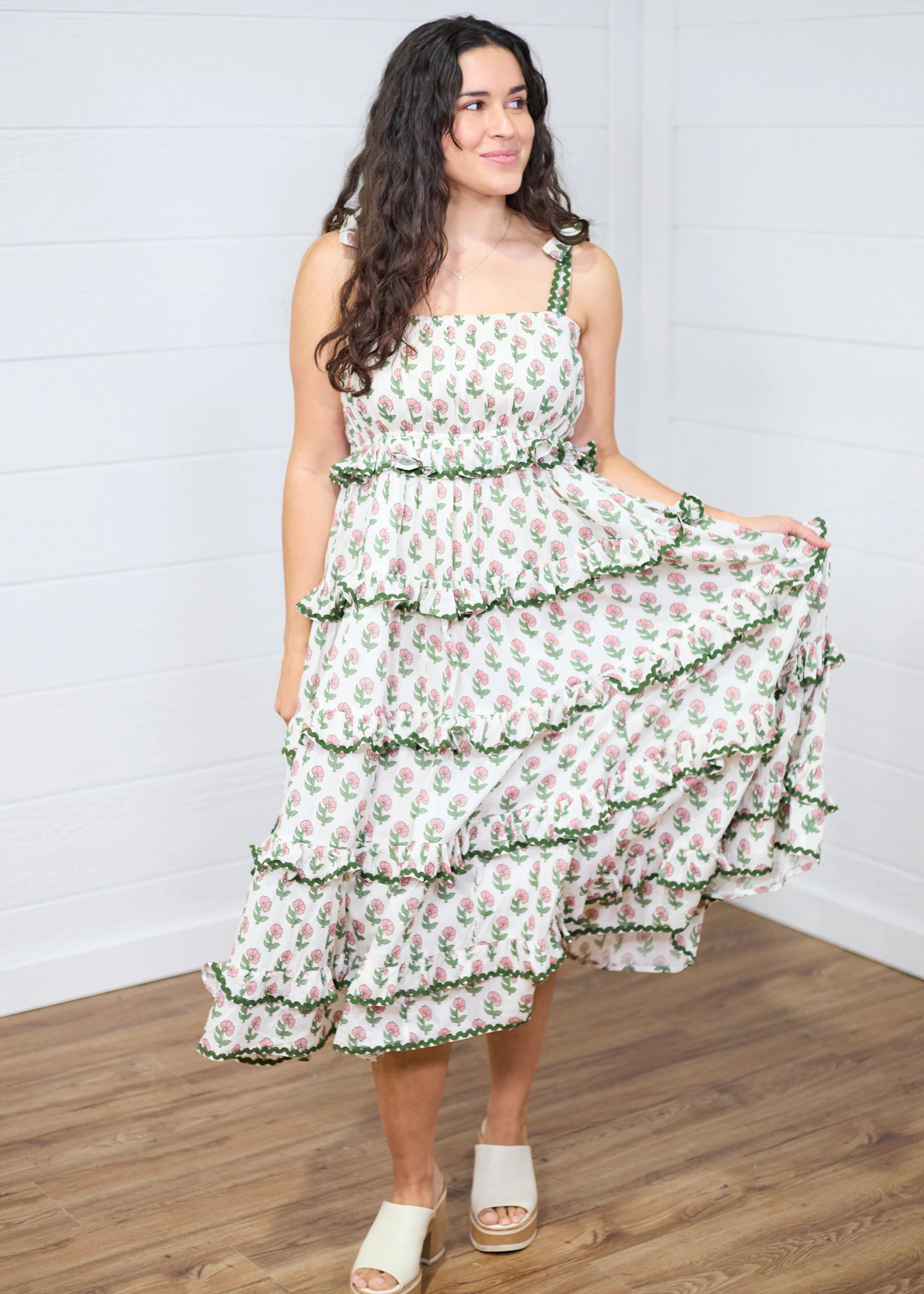 The Paloma Dress is a floral block pattern tiered dress. This dress has the prettiest ruffles and ricrac details. This...