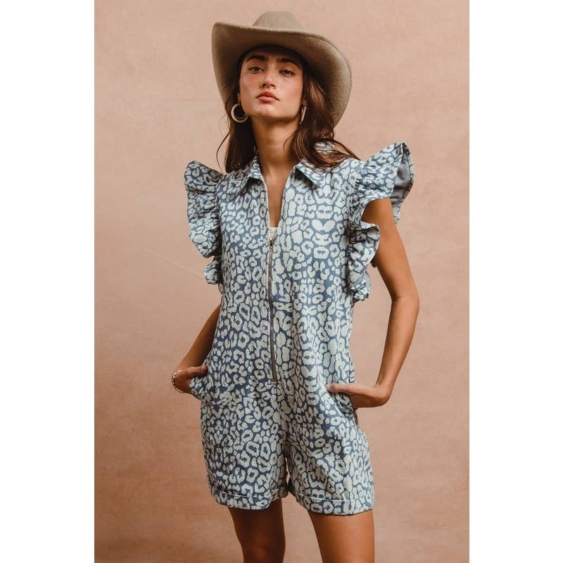 LEOPARD PRINT DENIM RUFFLE SLEEVES ROMPER