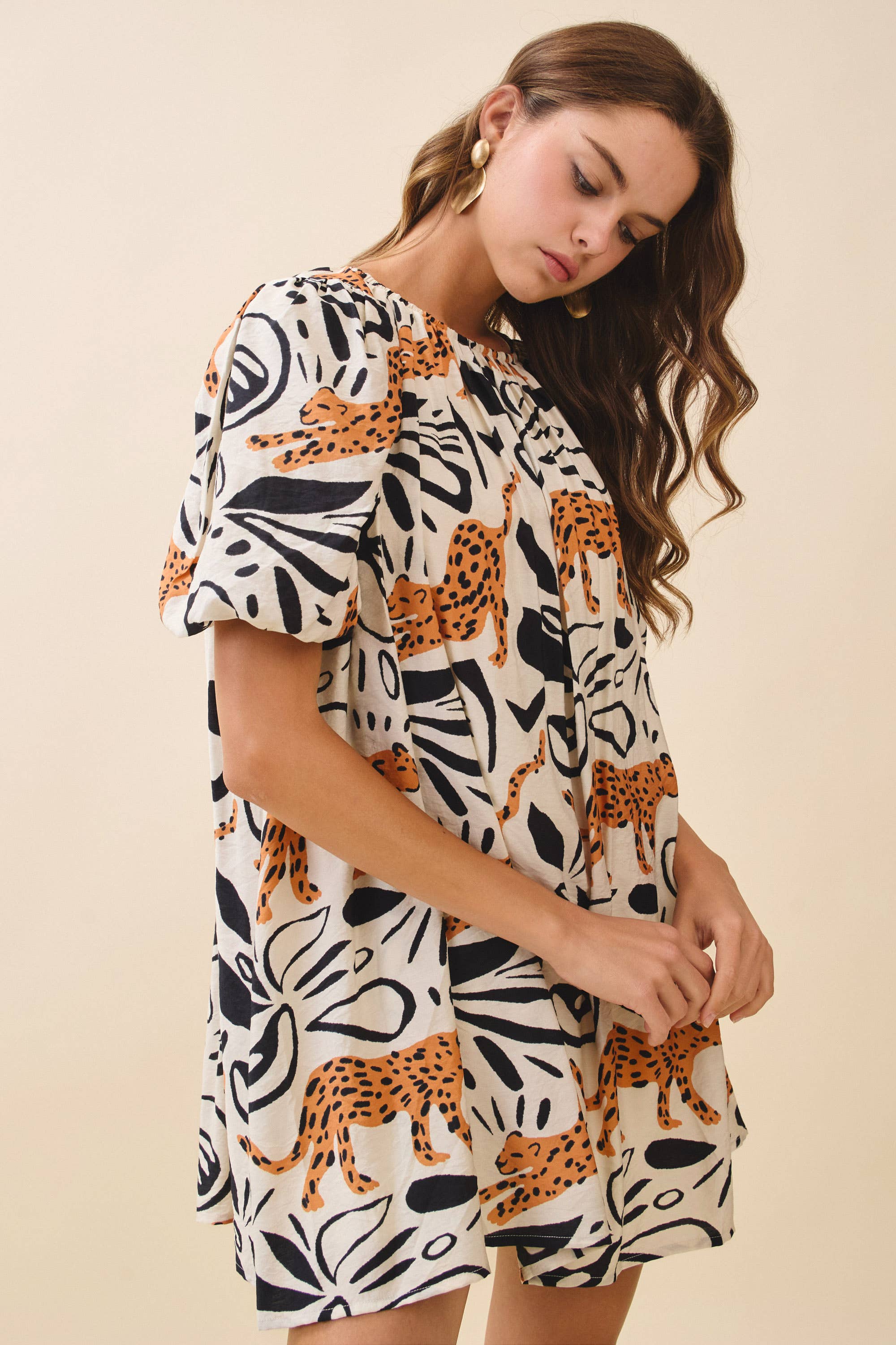 A mini dress featuring a bold leopard and abstract print. Designed with a gathered round neckline, voluminous puff sleeves, and...