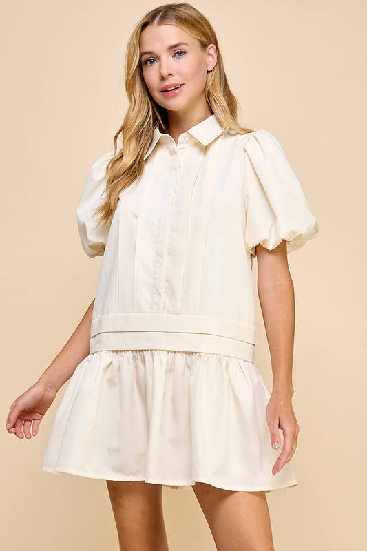 Collared shirt dress with puff sleeves. Featuring a button down detail, a pleated center and a ruffle hem.Â