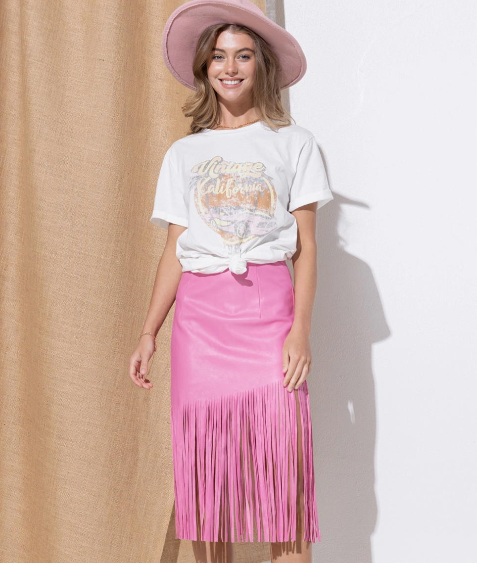 Experience the unique blend of style and comfort with Blue B's Faux Leather Fringe Knee Length Skirt. Crafted from 100%...