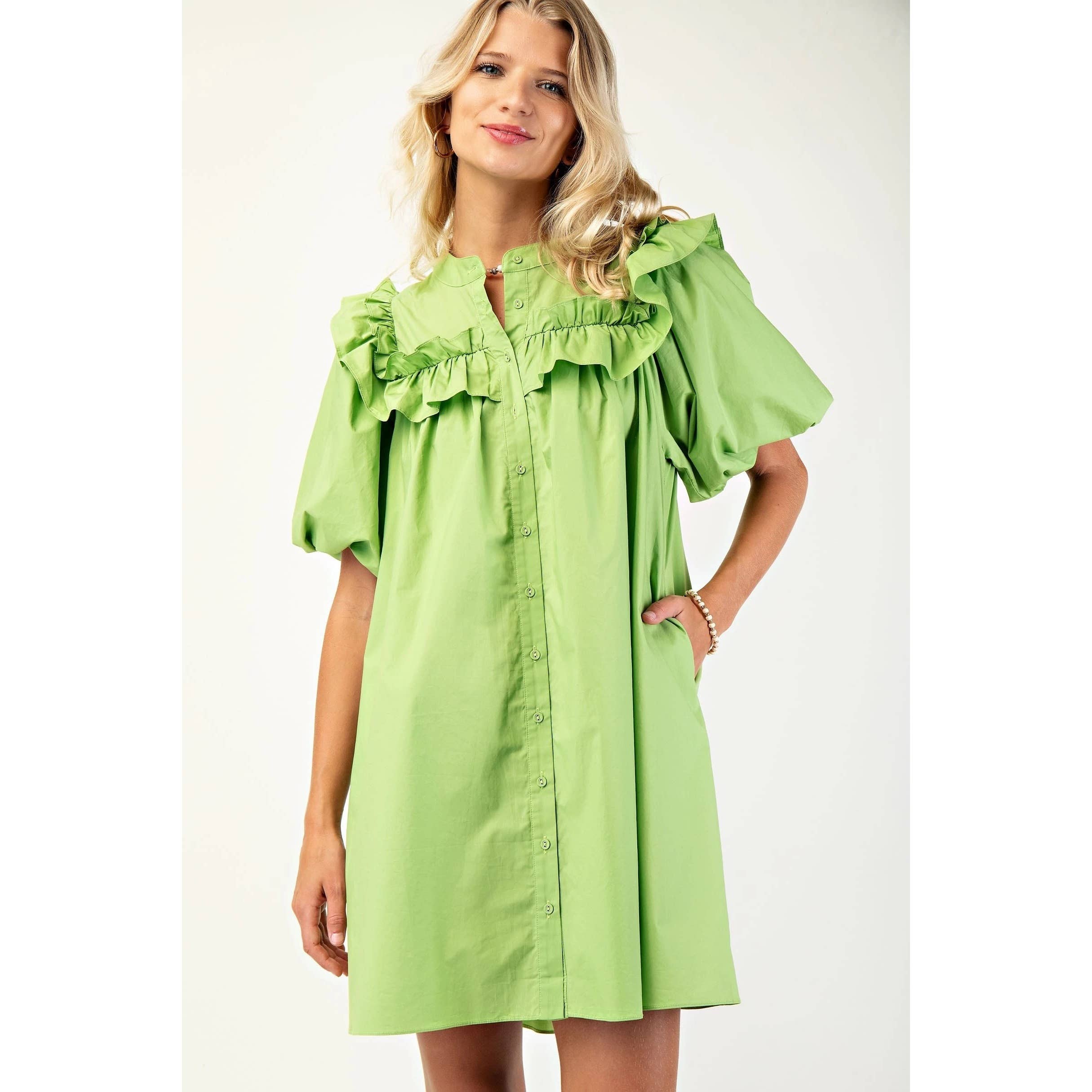 This playful mini dress features solid puff sleeves and a charming mandarin collar accented with delicate ruffle details.