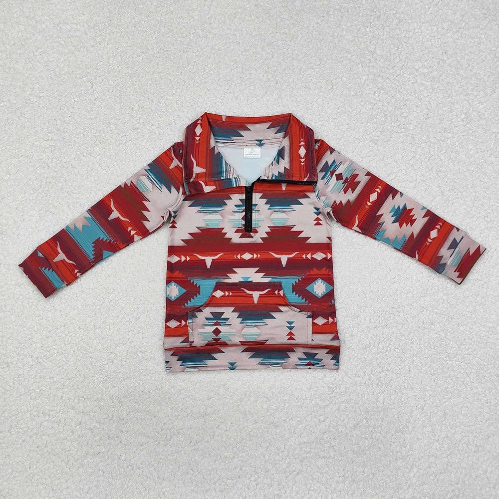 Made from soft and stretchy milk silk, this colorful quarter-zip pullover showcases a fun Western Aztec pattern perfect for boys...