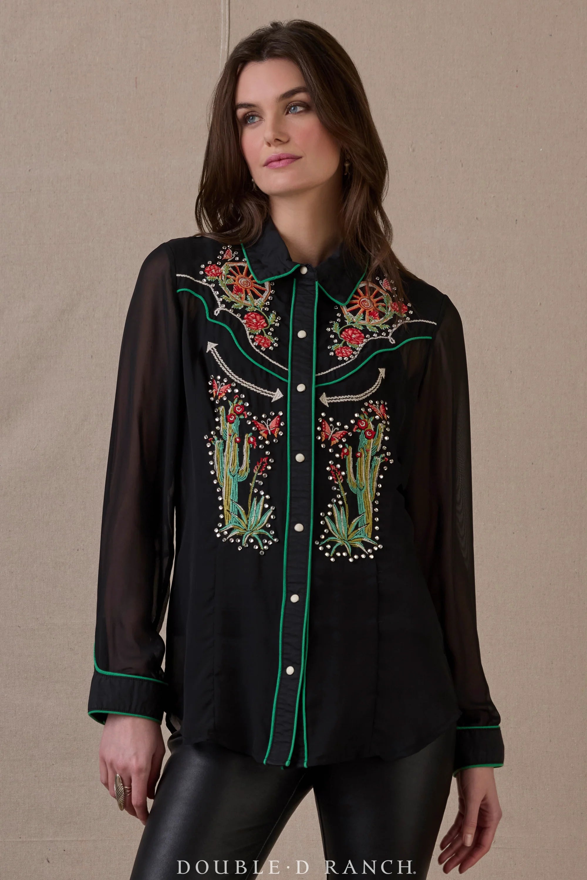 SHEER + SPARKLE Turn some heads in this twangy top! The classic pearl snap silhouette is given an edgy upgrade...