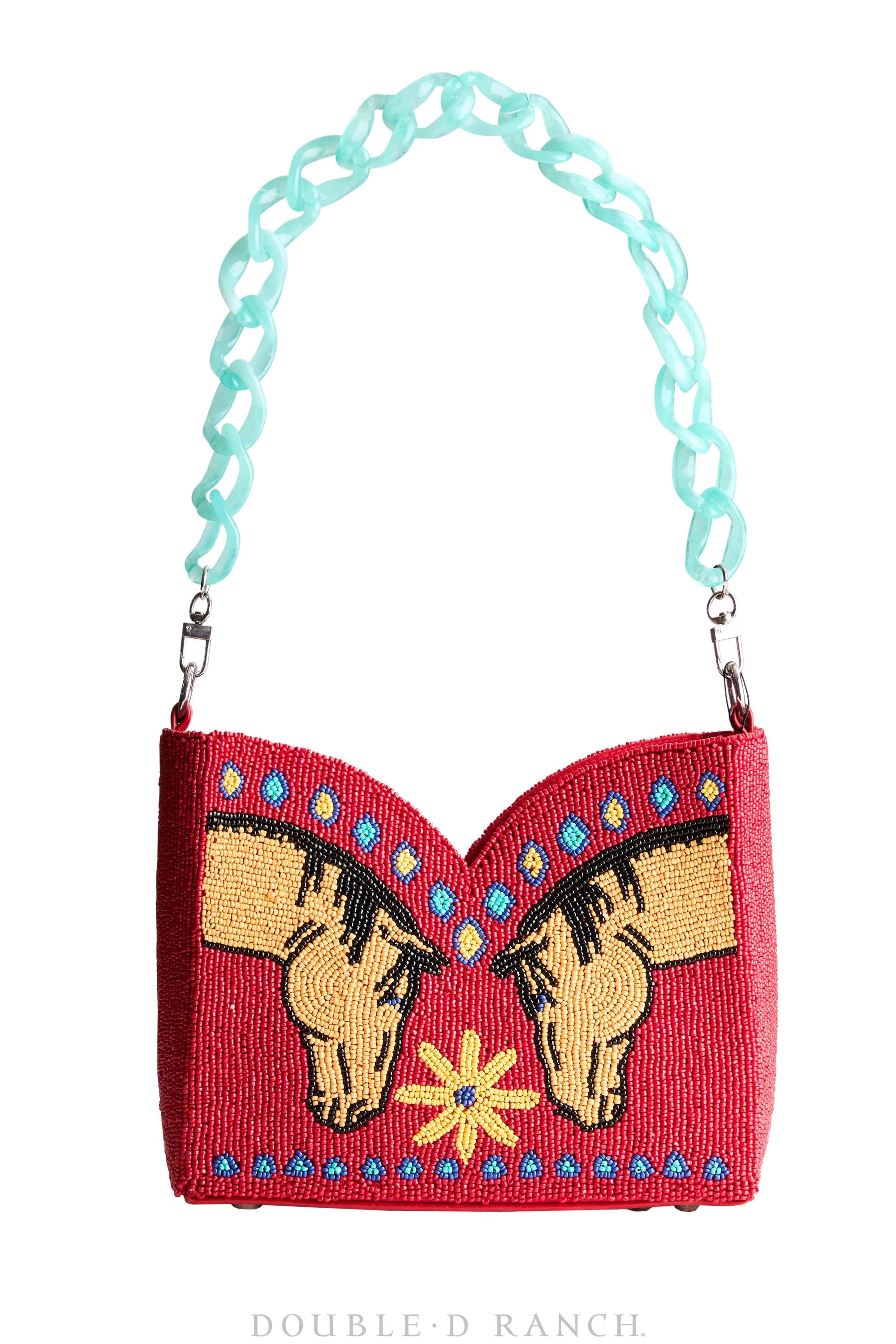 A new twist on our hand-beaded handbags! This limited-edition beauty swapped the bamboo handle for a fabulous turquoise acrylic chain...