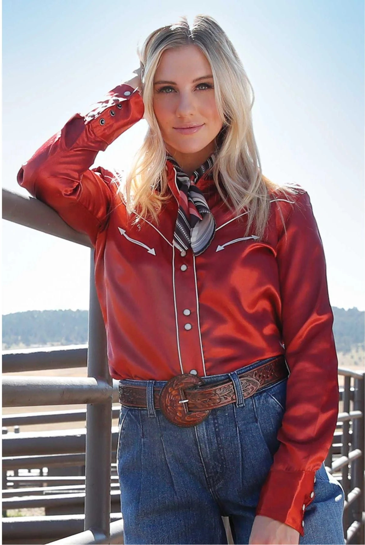 Step into stylish western vibes! This rust-colored satin shirt dazzles with pearl snaps down the front and on the cuffs....