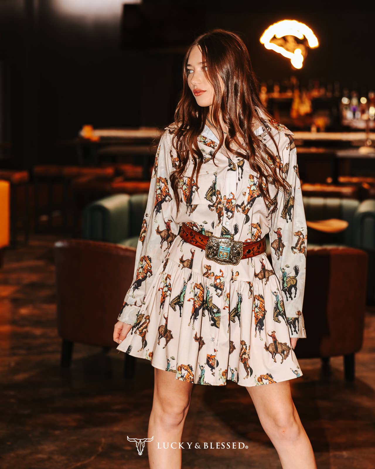 Printed long sleeve flowy button-down ruffle dress wit front chest pockets. nfr western rodeo