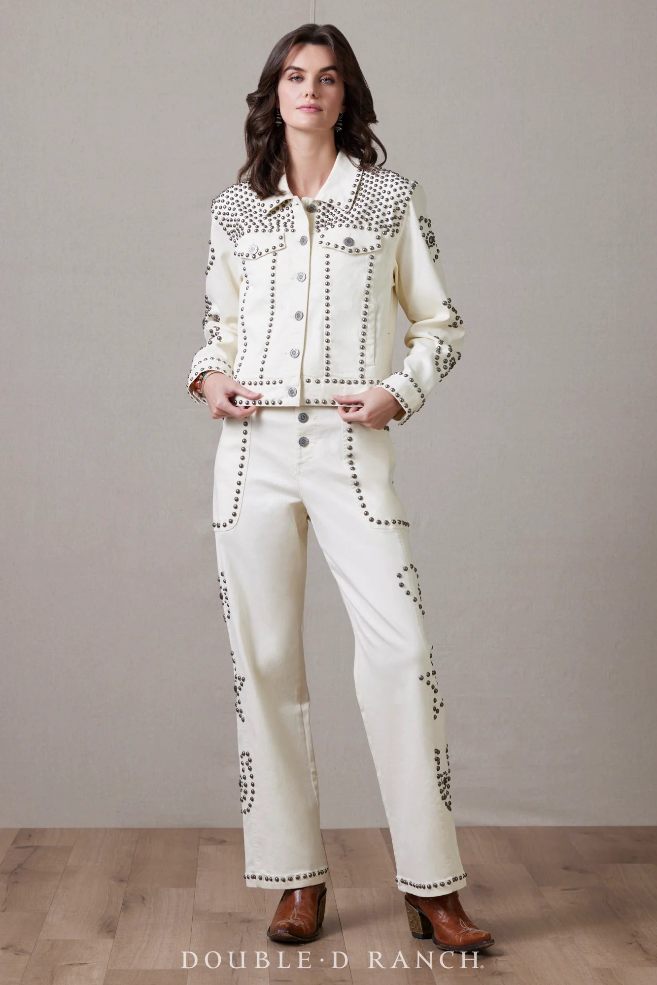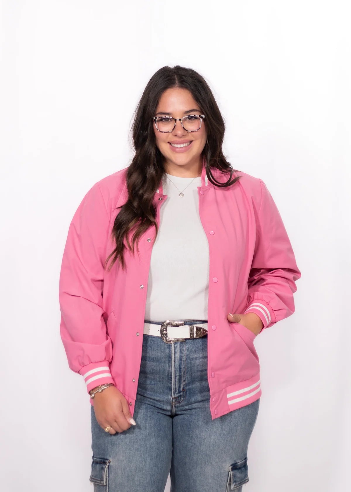 The Rodeo Bomber Jacket is a pink fabric with sequin detailing on the back writing out "Howdy". Pair on top...