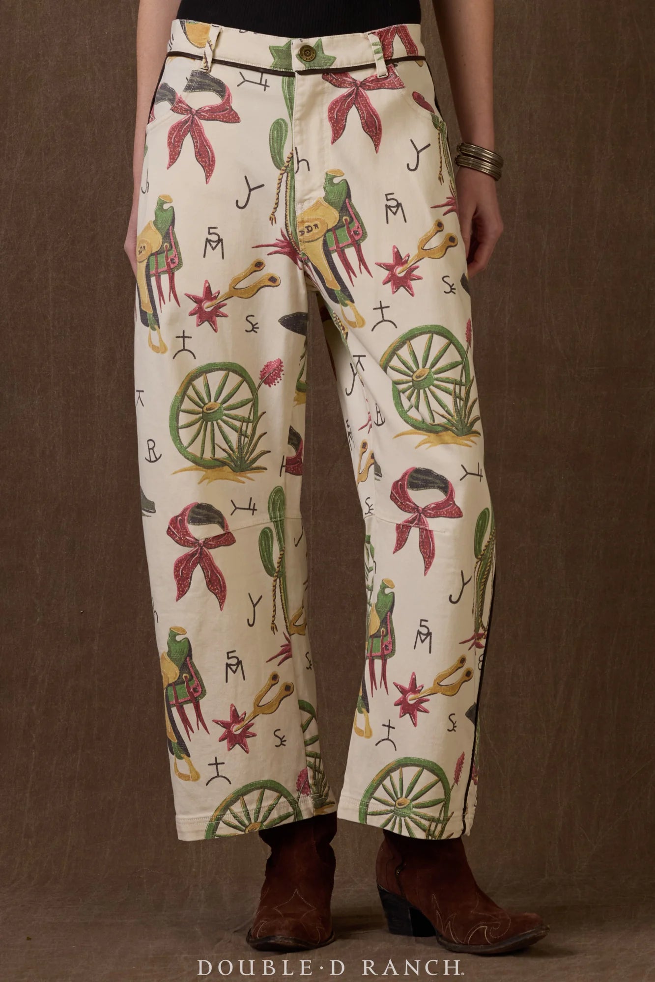 Easy-fit wide leg pants with allover vintage Western illustrations including cowboy boots, hats, cacti, and horseshoes. Features a textured creased...