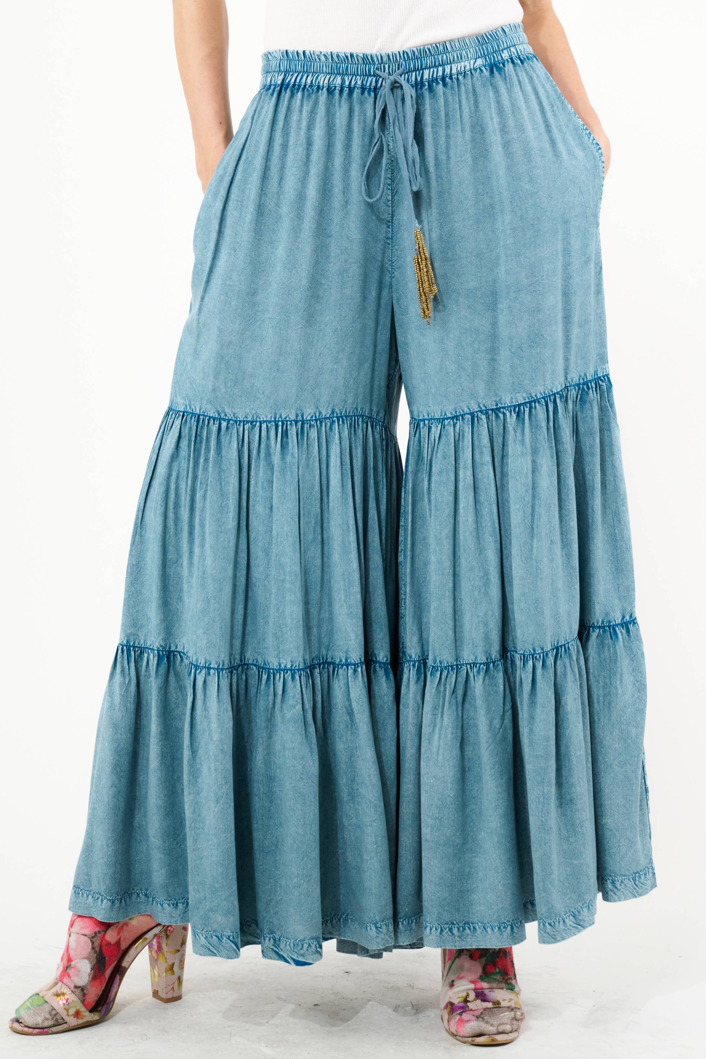 Washed denim tiered wide leg pants featuring drawstring elastic waistband and side pockets. Also available in sizes 1XL to 3XL:...