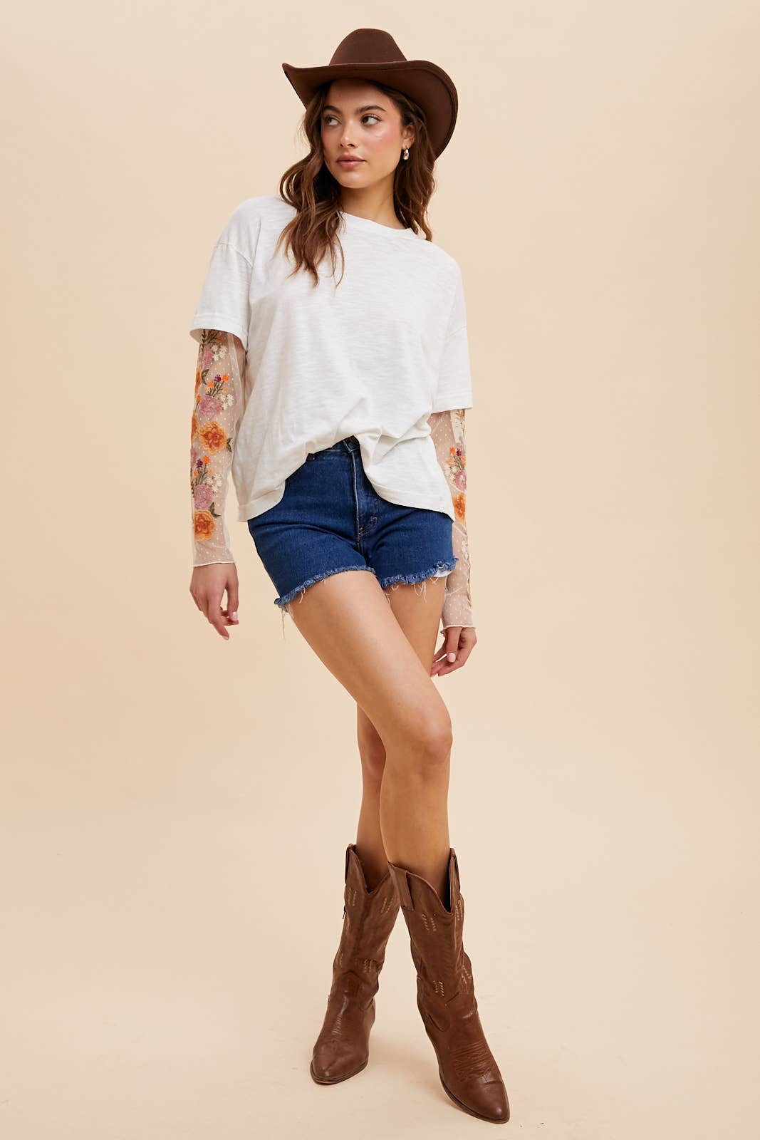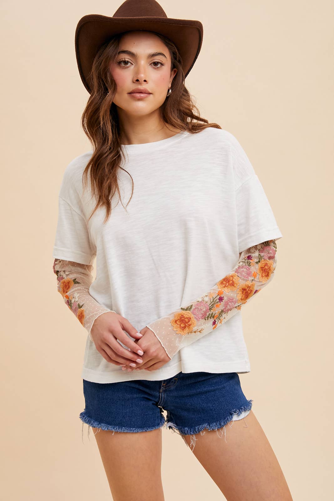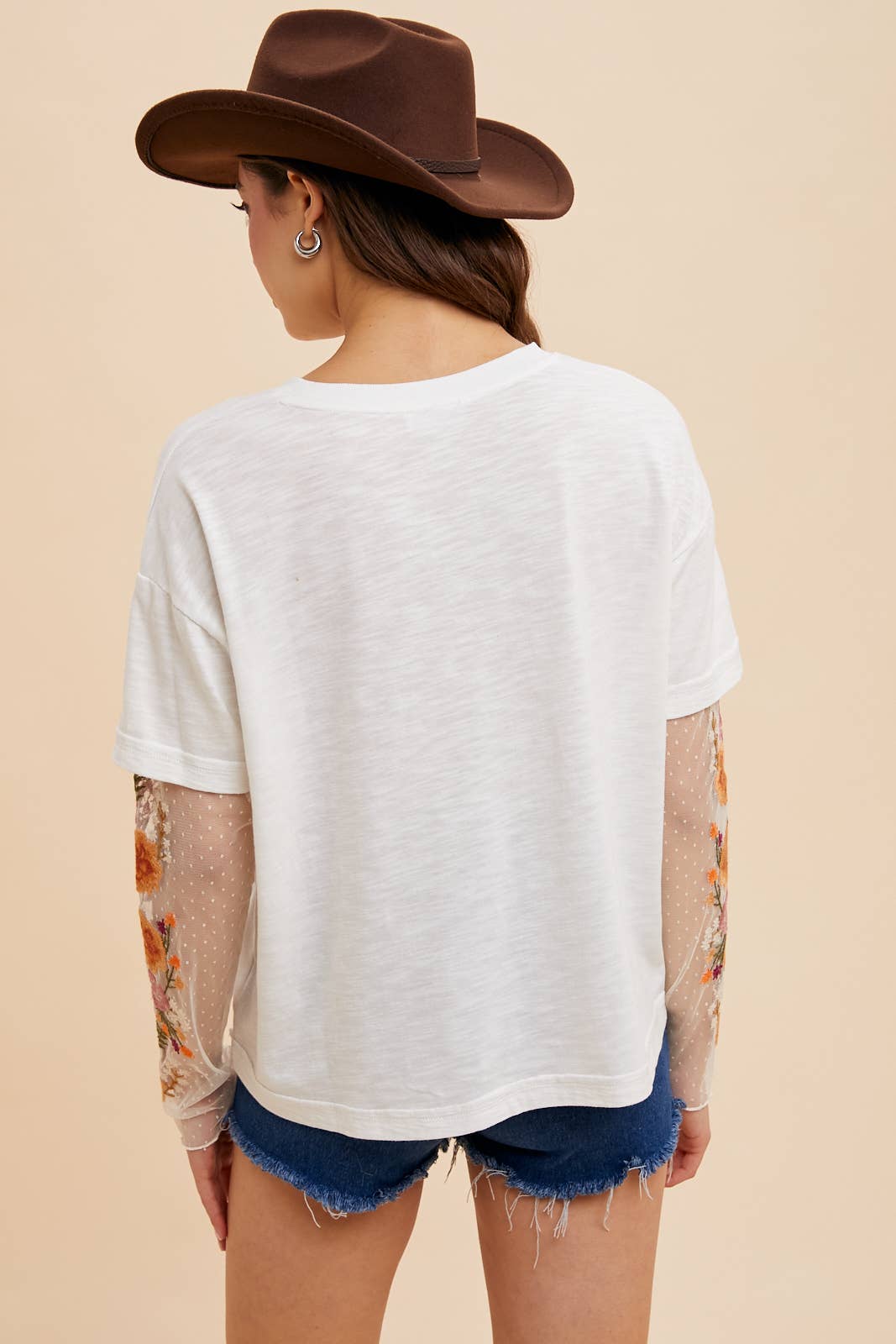 This playful twofer sleeve top features a dotted mesh overlay adorned with charming floral embroidery. Crafted from soft cotton, it...