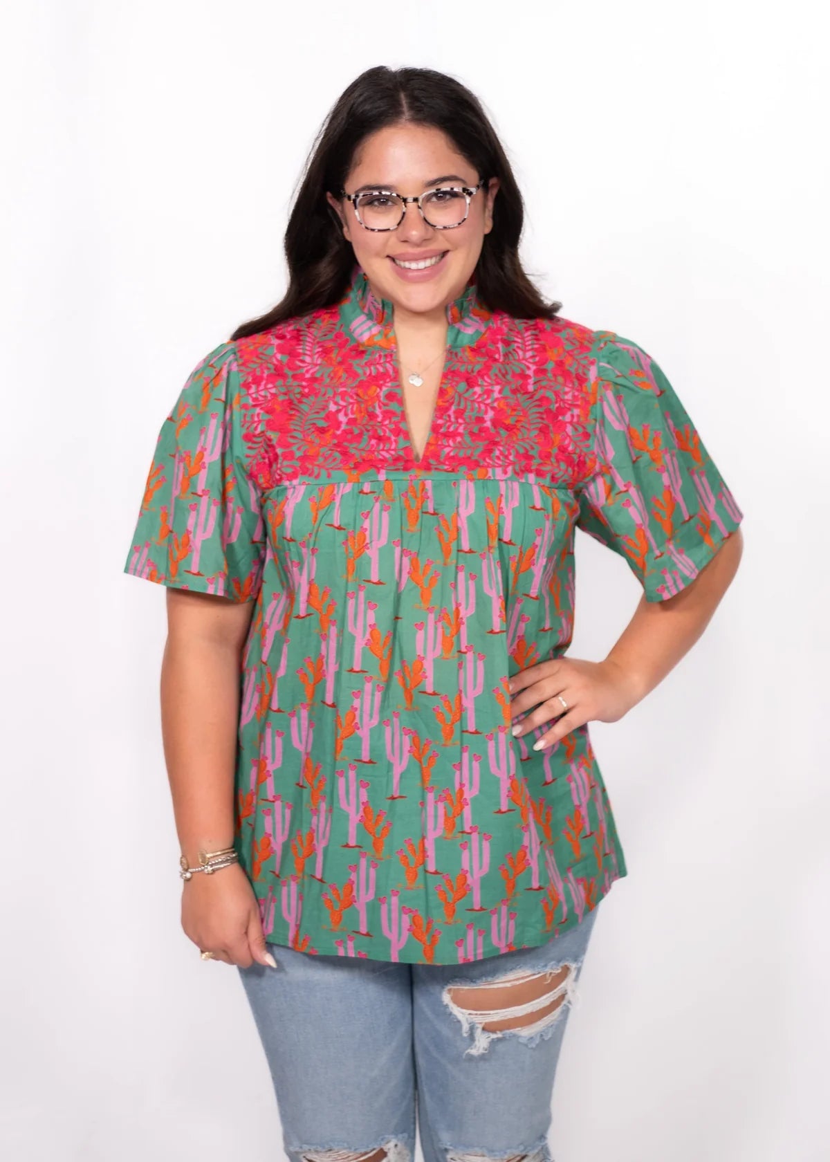 This top is so fun for springtime! The Kara top is a cactus print v-neck with pink embroidery on the...