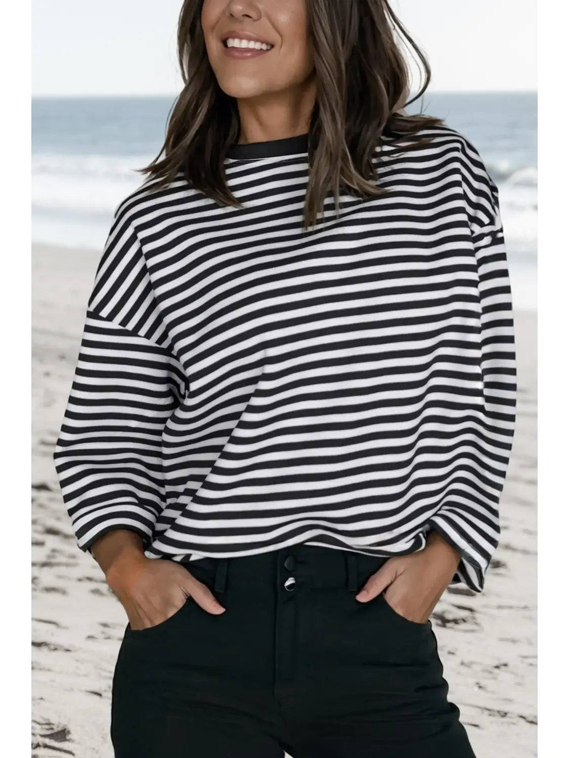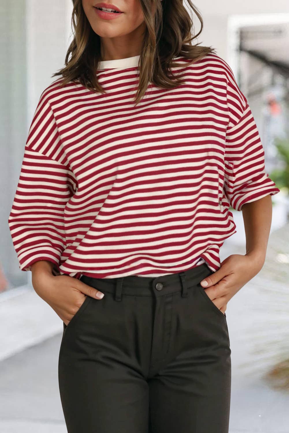 This playful striped tee features a drop shoulder design with a peekaboo cutout back, finished with a tied bow...