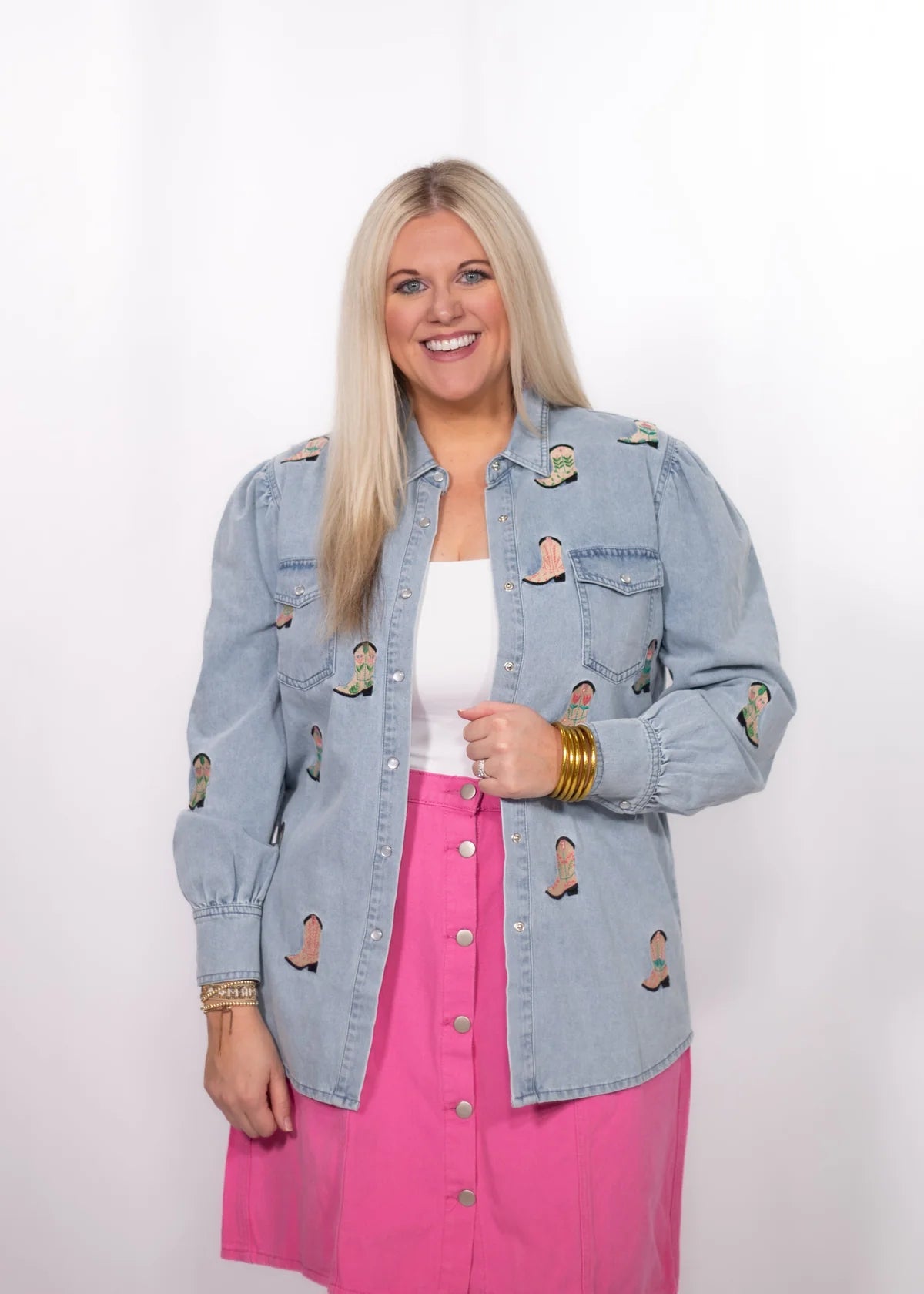A top or a jacket, style it either way! The Mini Pearl Top is a denim button up with small...