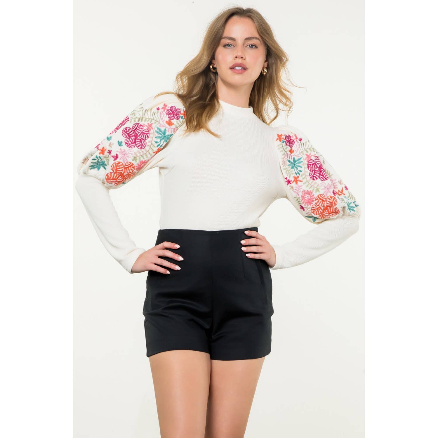 This playful embroidered bishop sleeve top is crafted from a soft woven fabric blend of 95% polyester and 5% spandex,...