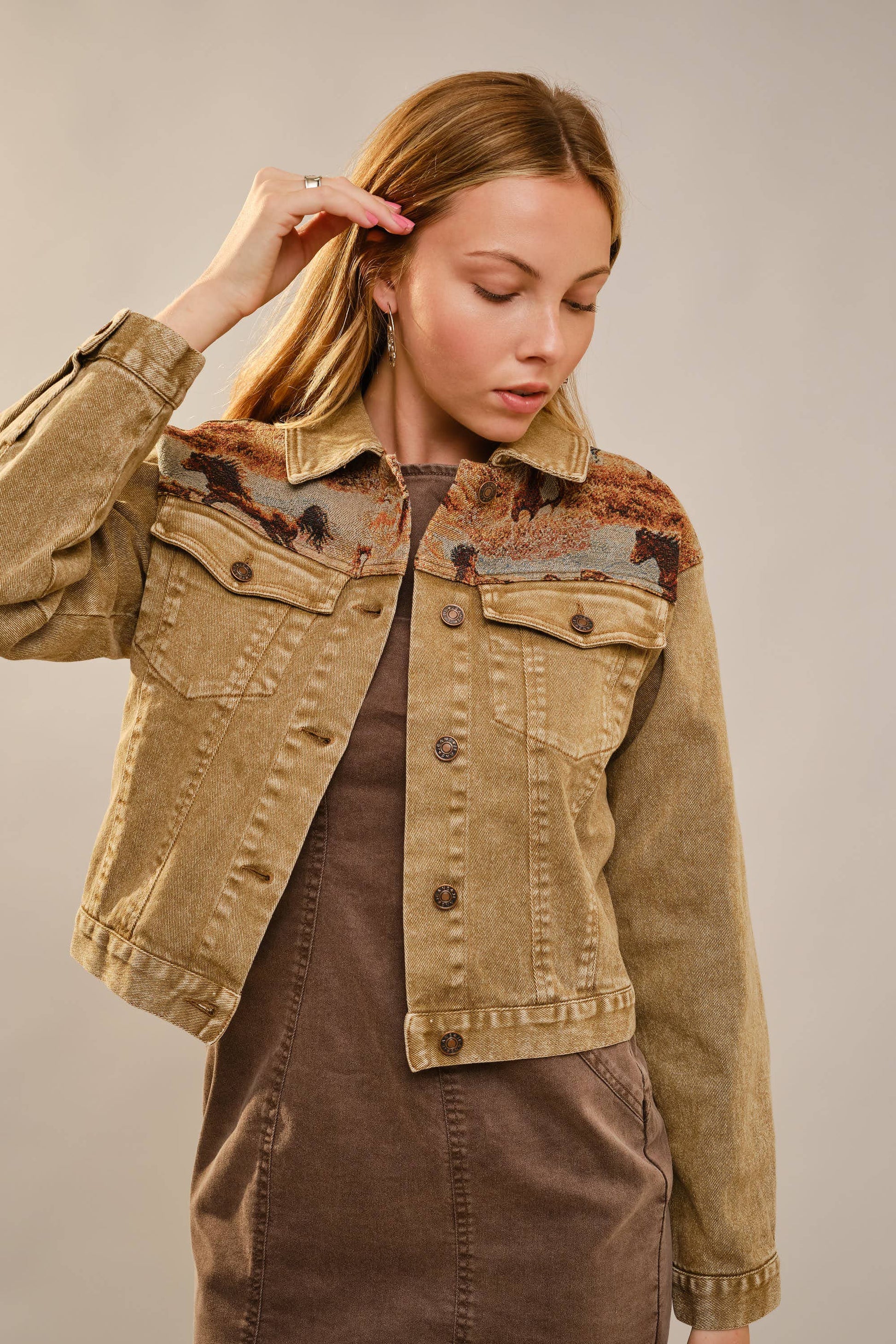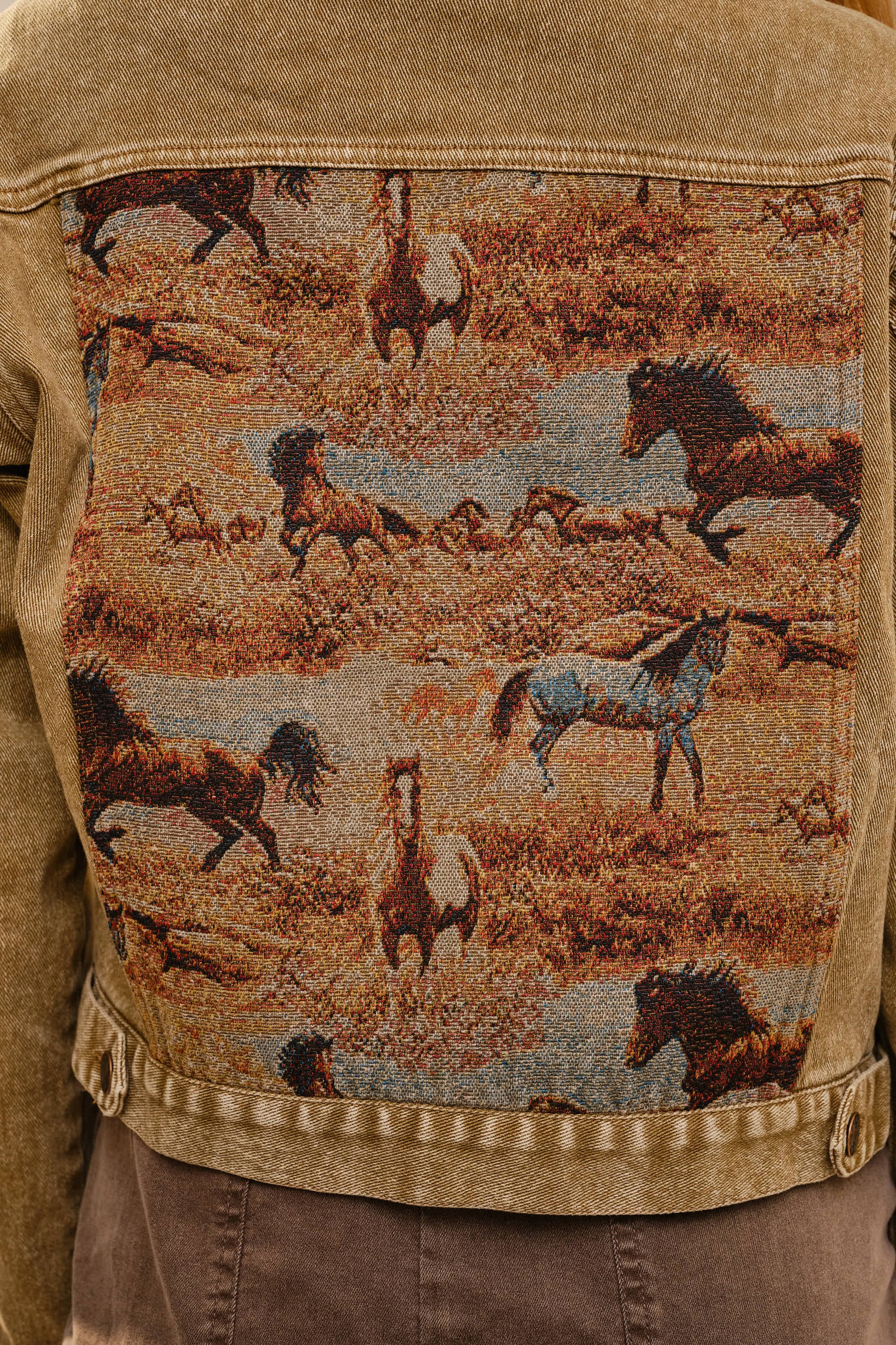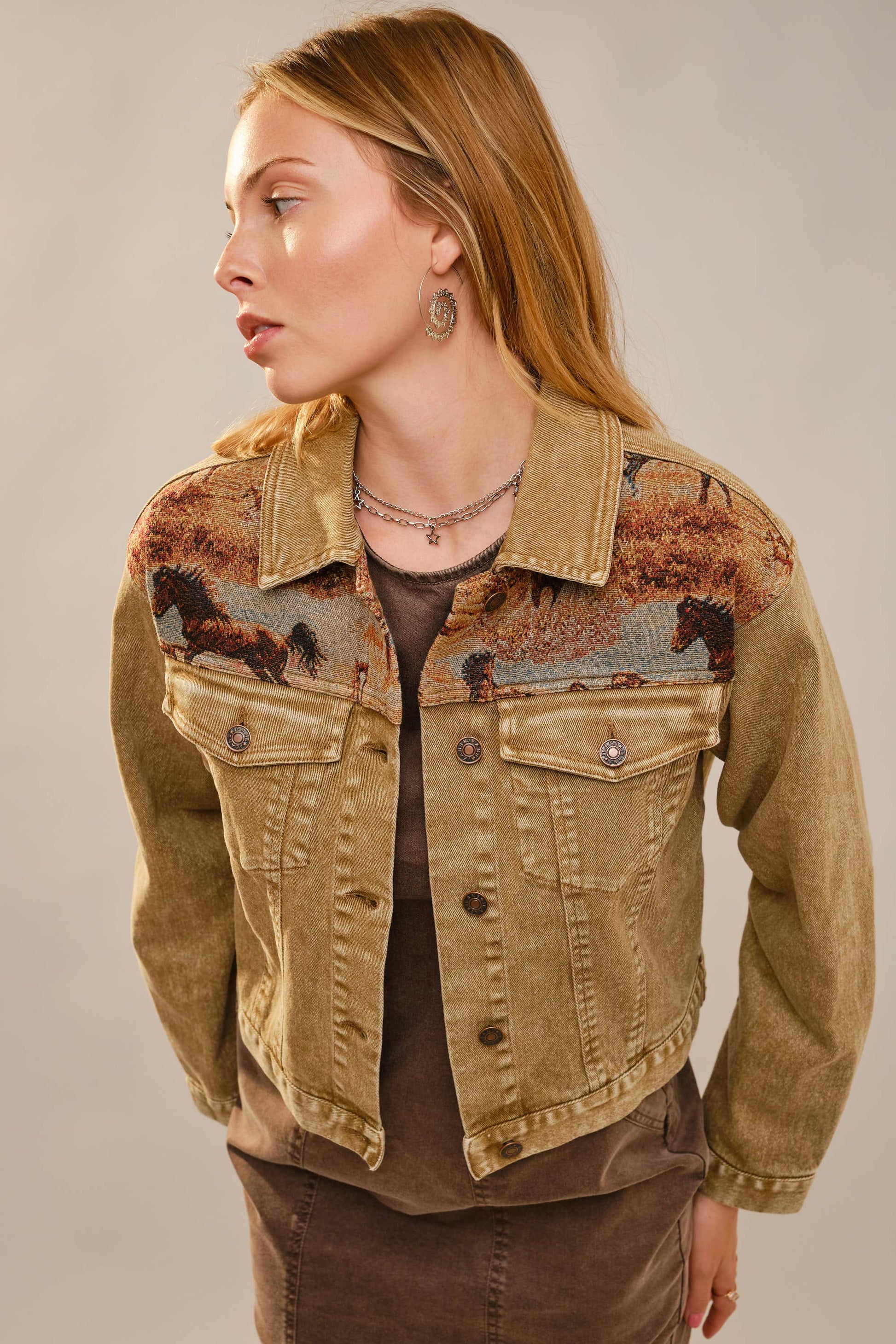 Cropped denim jacket with button-front closure, chest flap pockets, and woven horse tapestry panels at the front yoke and back for a western-inspired look. 98% Cotton, 2% Spandex Model is 5'8" tall and wearing size Small