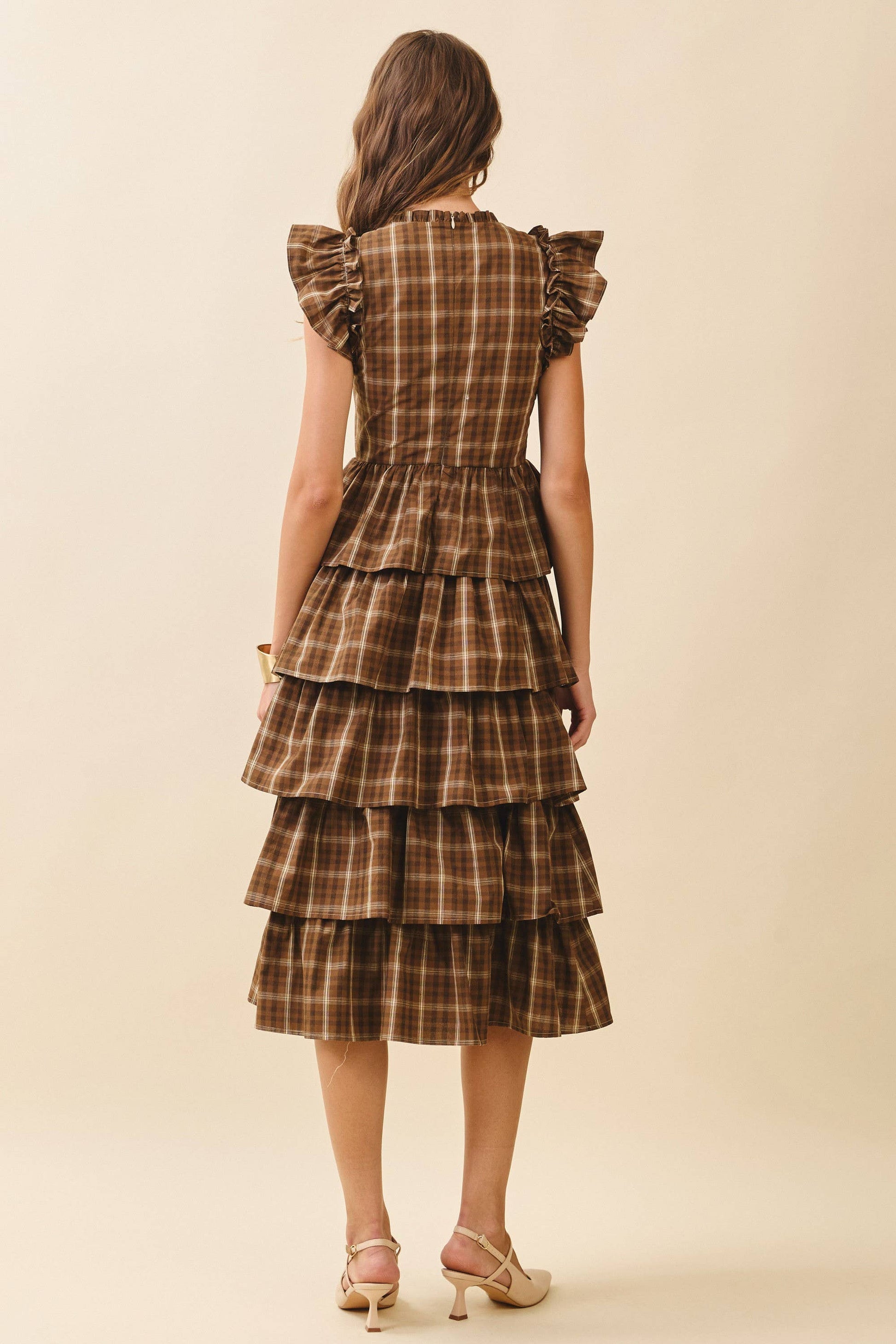Plaid midi dress featuring a round neckline and ruffled cap sleeves. Designed with a fitted bodice and a tiered ruffle skirt. Finished with a concealed back zipper.