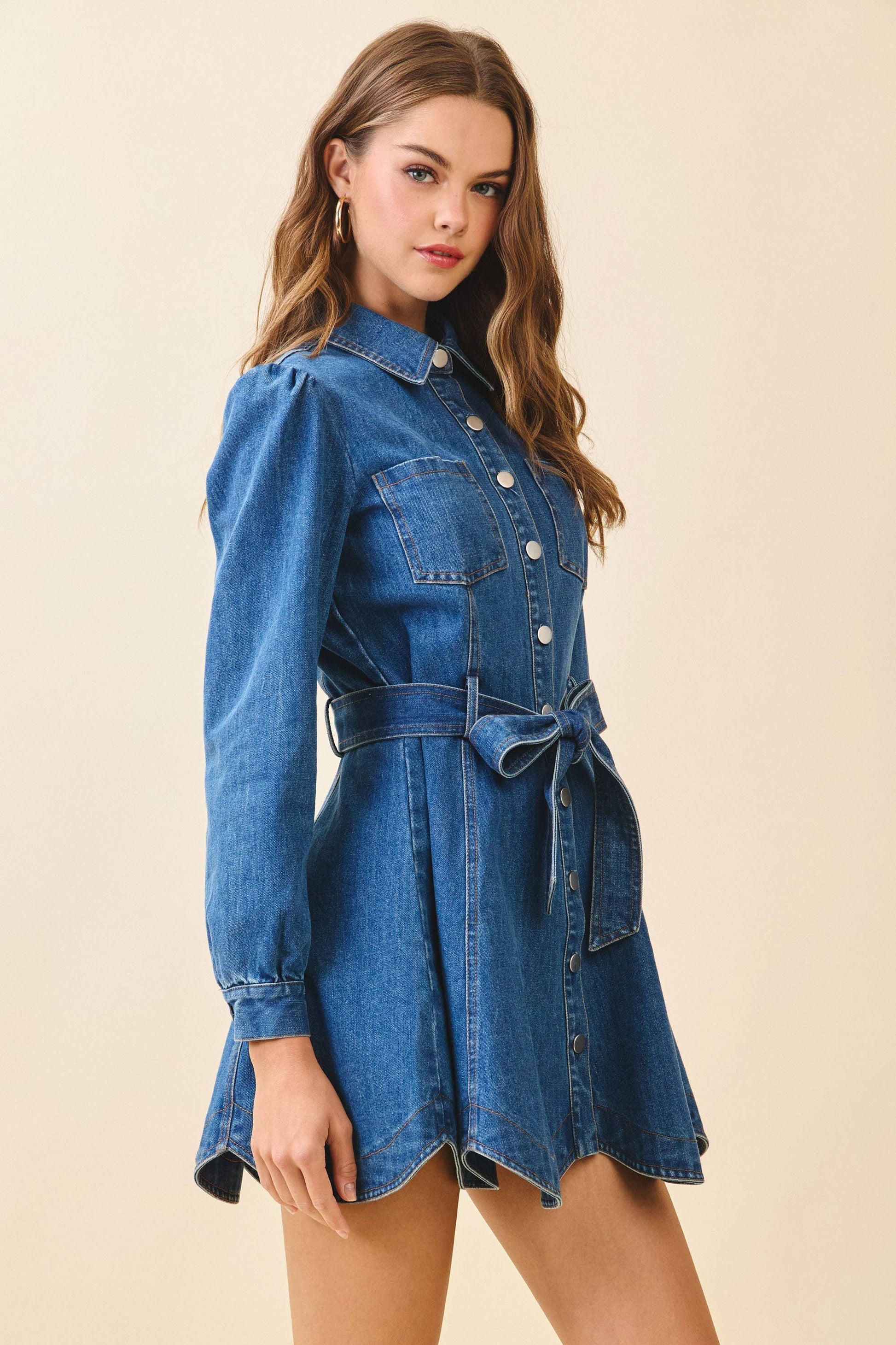 Denim shirt dress featuring a collared neckline, long puff sleeves with button cuffs, and front flap pockets. Designed with a snap button-down front and a self-tie waist belt. Finished with a flared hem.