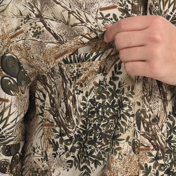 Gear up for the outdoors with the Explorer Shirt | Long Sleeve, crafted for ultimate versatility in the field. Featuring lightweight microfiber fabric with UPF 50+ sun protection, it's a reliable layer for extended hunting trips, fishing excursions, or all-day hikes. Mesh-lined vents at the chest and back keep air flowing, while the quick-drying and wrinkle-resistant design ensures lasting comfort. Button-to-bungee closures at the sleeves let you adjust for changing conditions, and hidden chest pockets provide easy access to essentials. Built-in stain resistance and a lens cleaner add durability and practicality, making it an excellent choice for rugged adventures. With a lay-flat collar and tagless design, this shirt merges performance with effortless style.