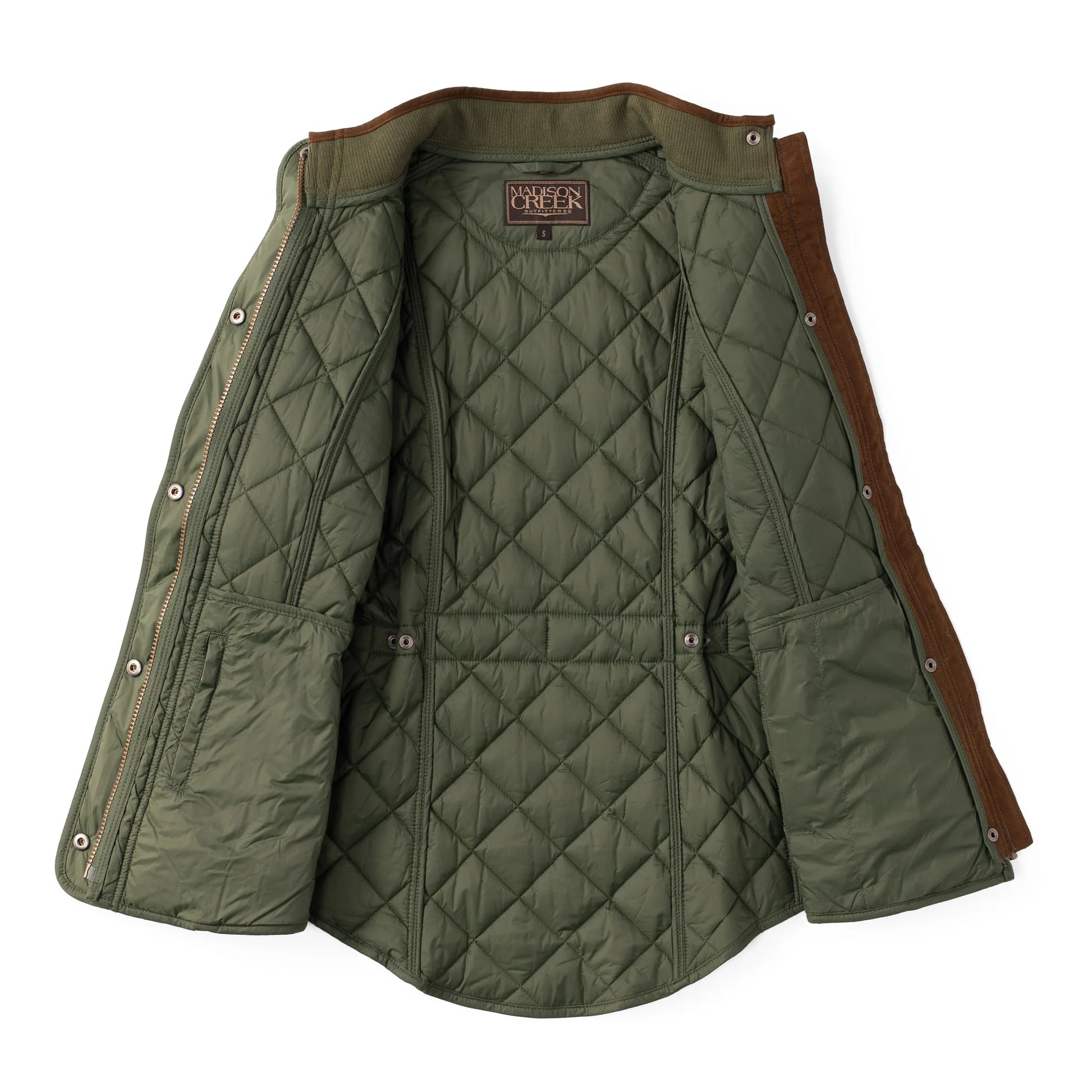 Designed with the same stylish functionality as our popular Vista Vest, the Georgia Diamond Quilted Nylon Jacket provides lightweight warmth without the bulk, making it the perfect outer layer. The zip front closure is complemented by a storm flap featuring Madison Creek's signature "MC" branded pewter snaps, offering a secure fit with a touch of distinction. Refined microsuede trim adds subtle elegance, while the belted adjustable back creates a tailored silhouette for a flattering fit.
