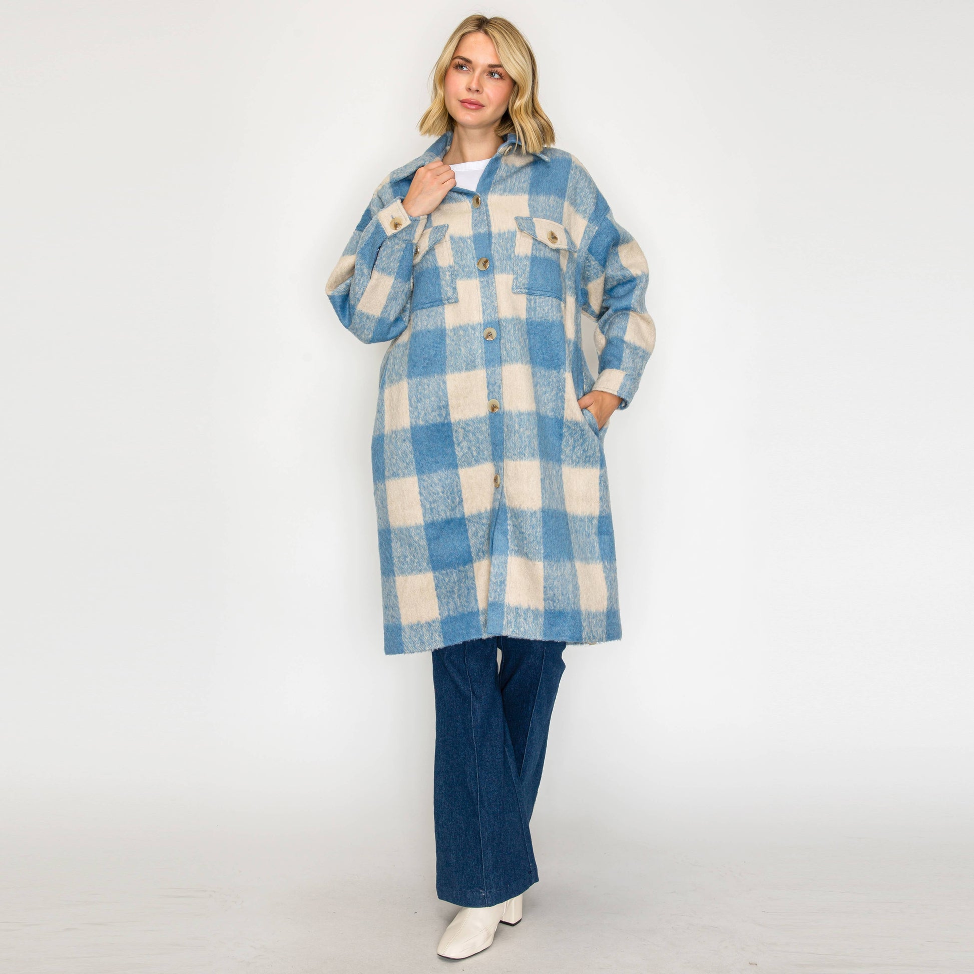 Stay cozy and chic with this statement plaid longline shacket. Featuring a soft brushed fabric in a blue and ivory check pattern, this versatile piece blends the warmth of a coat with the casual vibe of an oversized shirt. Designed with button-front closure, chest flap pockets, and a relaxed fit, it’s perfect for layering over your favorite denim or knits. Dress it up with boots or keep it laid-back with sneakers—either way, this piece will be your go-to for effortless cool-weather style. - Button-front closure - Chest flap pockets with button detail - Side pockets - Longline silhouette for extra coverage - Soft brushed fabric with cozy hand feel - Relaxed fit - 100% POLYESTER * LINING - 100% POLYESTER